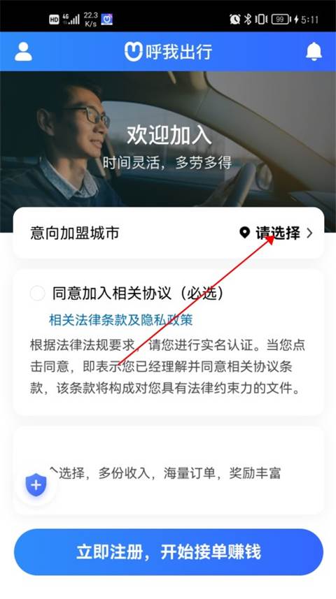1、在本站下载安装并打开呼我司机极速版,进入软件首页,点击意向加入城市。