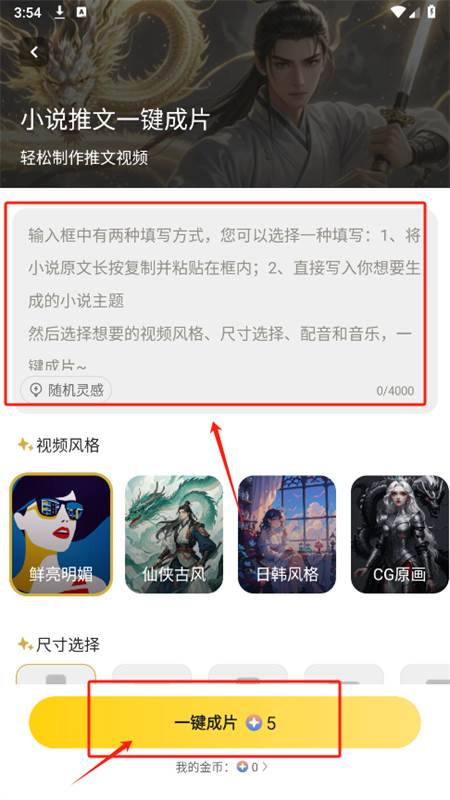 2、点击小说推文,输入小说主题,选择自己喜欢的视频风格、尺寸等,点击一键成片即可