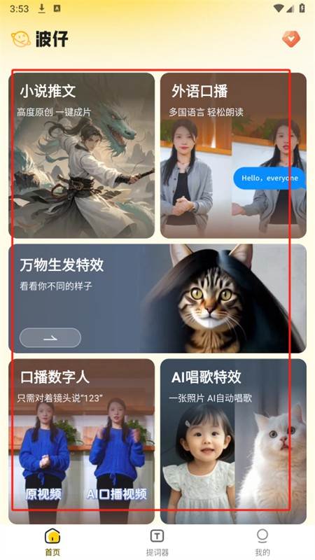 1、打开软件进入主页后可以看到小说推文、外语口播、万物生发特效等功能