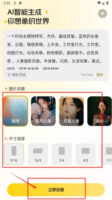 4、选择喜欢的图片风格、尺寸,输入详细的灵感描述点击立即创建即可快速生成