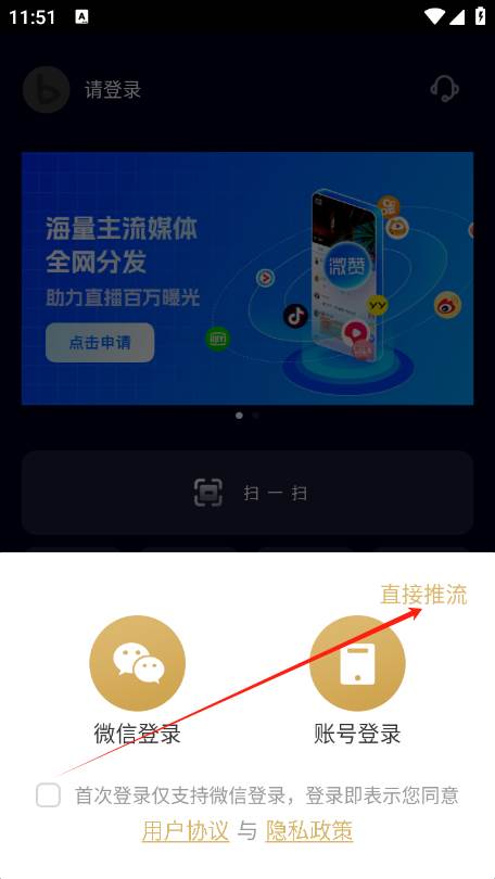 3、然后选择直接推流,您也可以选择登录保存直播推流设置