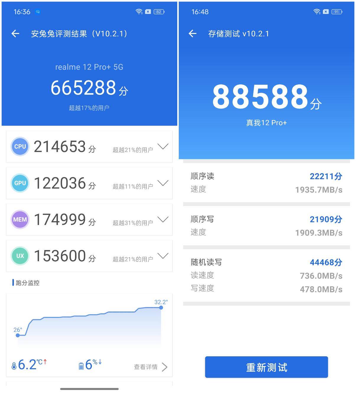 我们手中的这台12GB+512G版本的真我12 Pro+的跑分成绩为665288分,CPU成绩为214653,GPU成绩为122036;存储测试中,随机读取速度为1935.7MB/s,随机写入速度为1909.3MB/s,总成绩为88588分。