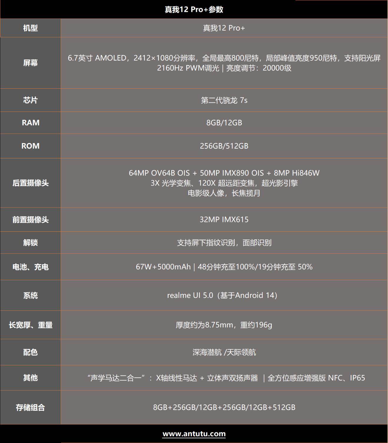 按照惯例,先看一下真我12 Pro+的配置详情,我们拿到的版本是主打的深海潜航配色,12+512G版本的存储,所以以下内容均基于这款版本来讲: