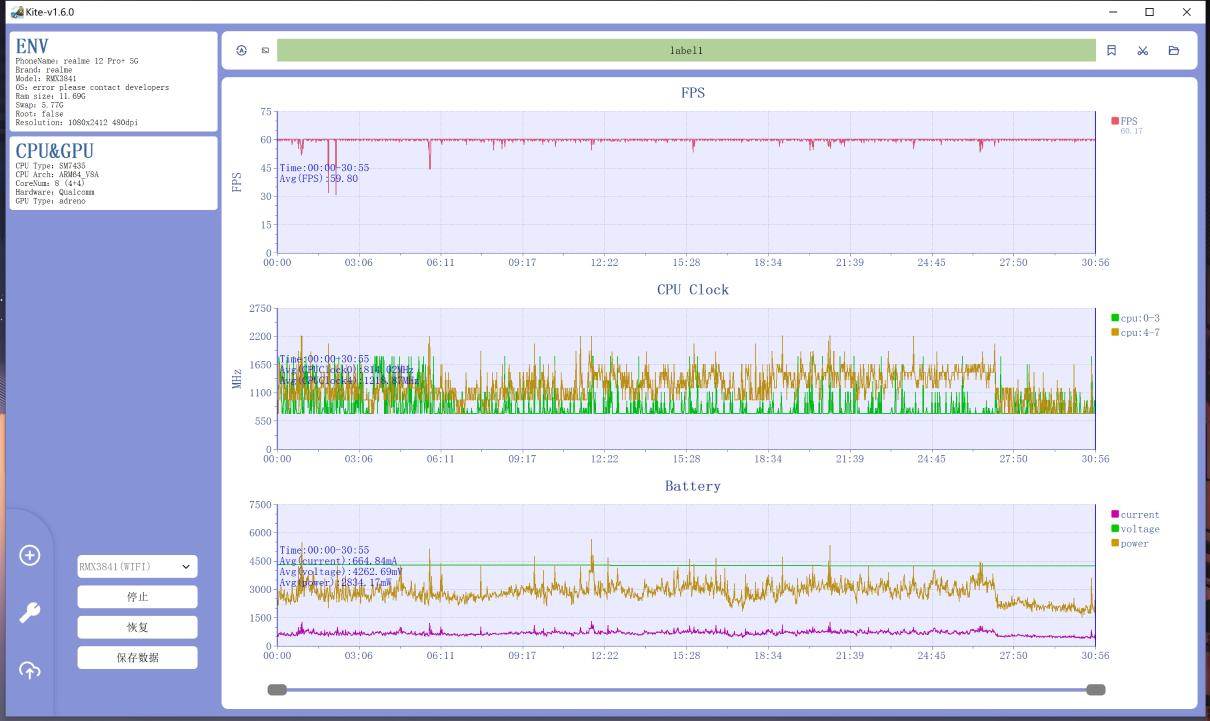 30分钟游戏时间,游戏画质为流畅+60帧模式,系统打开GT模式,电池也开启高性能状态,真我12 Pro+的耗电情况为8%,帧率的话还算稳定,30分钟综合59.80帧,完全没什么问题,游戏画面很流畅,体验也不错。