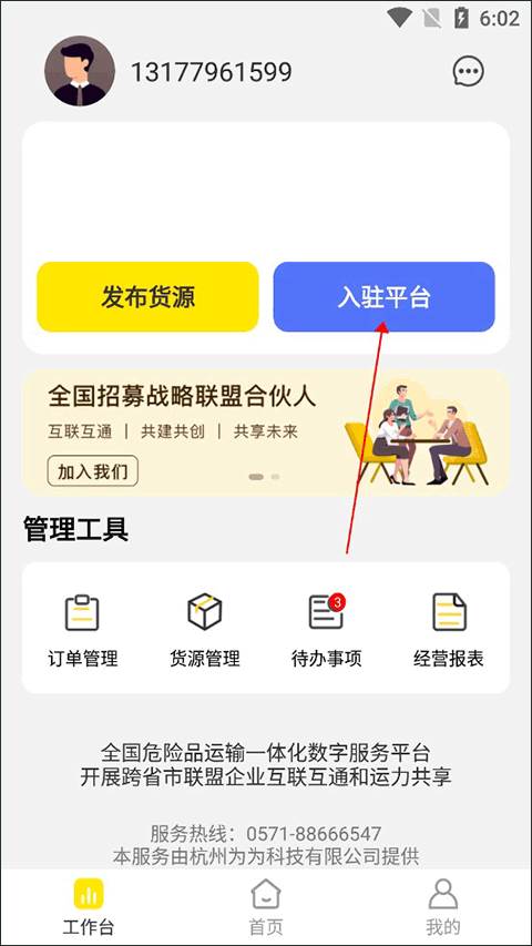 1、先进入危司机app点击主页的入驻平台。