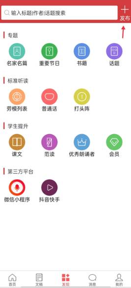 1、打开软件,选择下方菜单栏【发现】界面,点击右上角的“发布”。