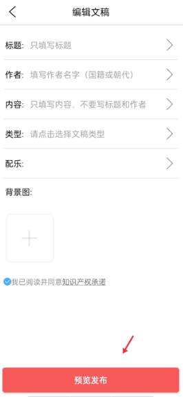 4、开始编辑自己的文稿,填写作品的具体细节,最后点击“预览发布”即可。