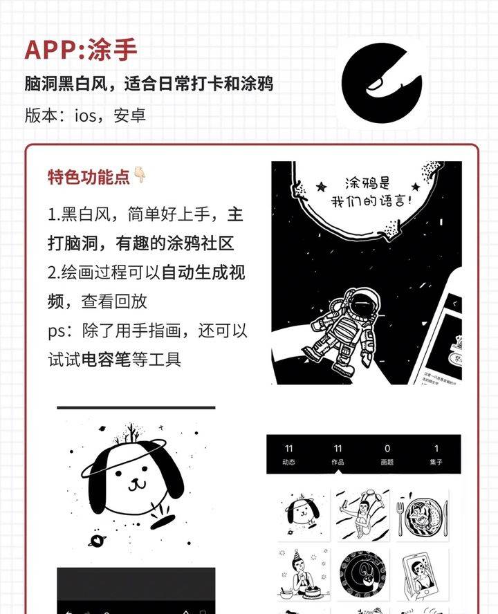 黑白风格,简单好上手,主打脑洞,有趣的涂鸦社区。绘画过程中可以自动生成视频,并查看回放。