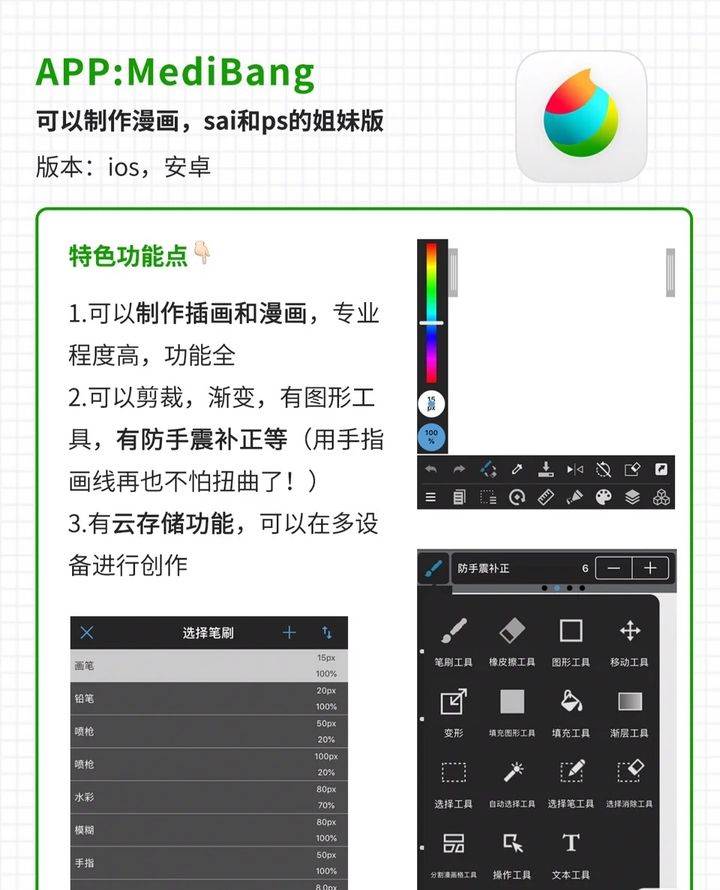 可以制作插画和漫画,专业程度高,功能齐全;可裁剪、渐变、图形工具、防手震补正、云存储功能等。