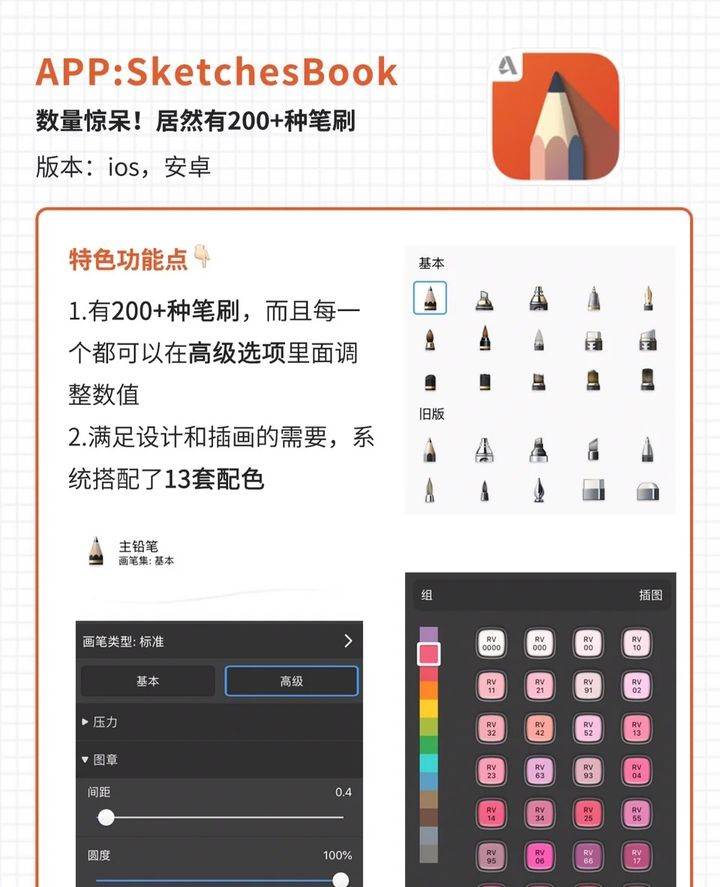拥有200+笔刷、并且系统还搭配了13套配色,足以满足设计师和插画师的需求。