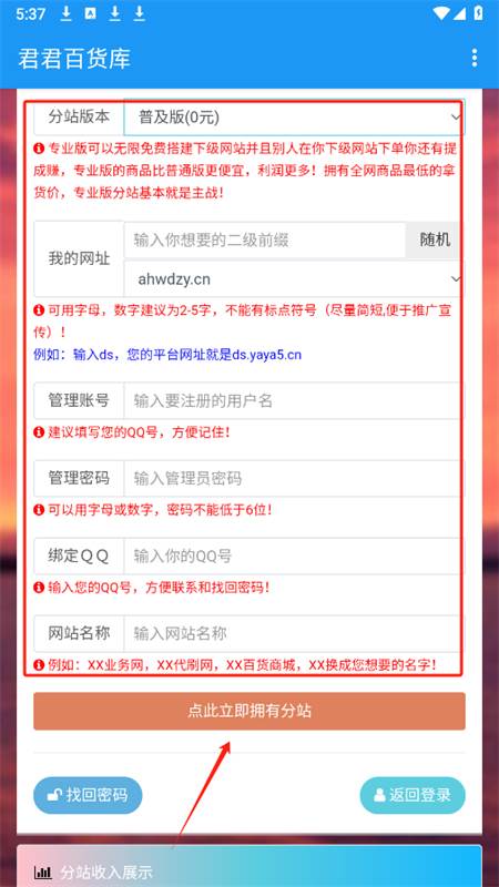 3、选择分站版本,输入平台网址,设置好账号密码等信息后,点此立即拥有分站即可成功注册