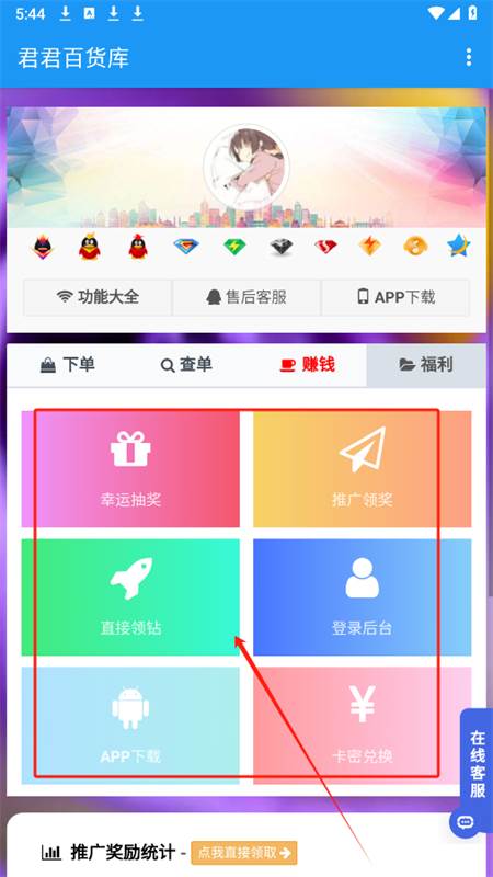 5、在福利页面,为大家提供了幸运抽奖、推广领奖、卡密兑换等福利