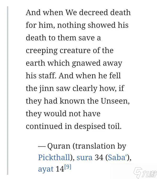 该段的出处与沙米尔(类似沙虫)有关,根据学者对内容的解读,所罗门死后,他的身体在很长一段时间内一直靠在他的手杖上,将近一年,直到“地球上的生物,一种蠕虫”(沙米尔),咬断了手杖,削弱了手杖,尸体倒在地上。就在那时,精灵才知道他很久以前就死了,而他们一直在努力工作,以为受到了所罗门王的监督,继续从事着占卜和祭祀。