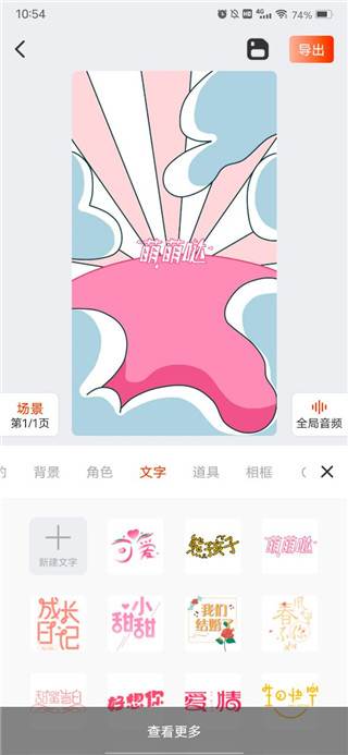 4、根据自己的需要添加背景、文字、音乐等,完成点击右上角“导出”;