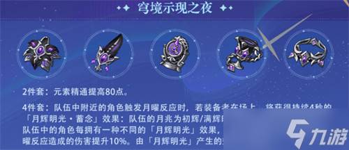 4件: 队伍中附近的角色触发月曜反应时,若装备者在场上,将获得持续4秒的「月辉明光·蓄念」效果:队伍的月兆为初辉/满辉时,暴击率提升15%/30%。队伍中的角色每拥有一种不同的「月辉明光」效果,队伍中的所有角色触发的月曜反应造成的伤害提升10%。由「月辉明光」产生的效果无法叠加。