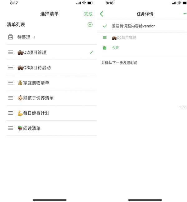 在清单视图下,点击「+新建任务」按钮,填写任务信息后点击保存,即可创建任务。在任务列表中,点击左侧的圆圈即可将任务标记为完成。标记完成的任务会自动进入已完成视图中,可随时取消勾选、方便找回。