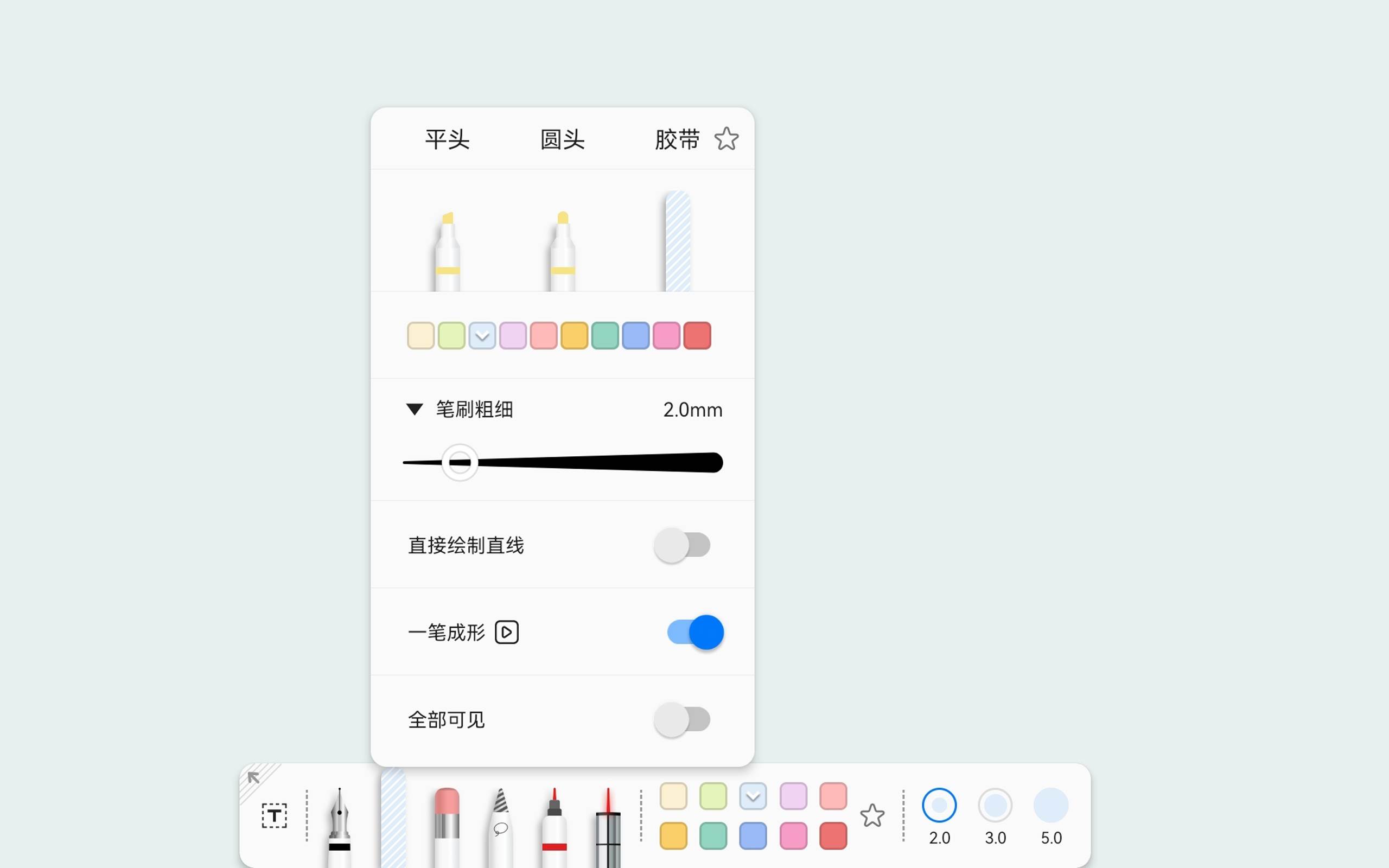 一个灵活百变的独特笔盒,可以随意拖拽和收起。每只笔单独预设对应的颜色与笔刷粗细,每本文档单独保存专属笔盒!当然,如果想把笔盒设置为全局,也没问题。