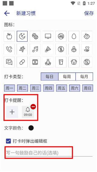 3、确定你的打卡任务,选择打卡提醒时间,还可以编辑一句鼓励自己的话;