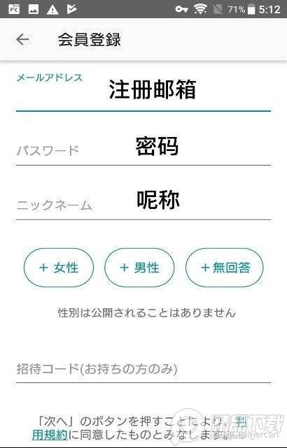 从上而下分别是:邮箱地址、密码、呢称,选择性别。无回答意味着保密。