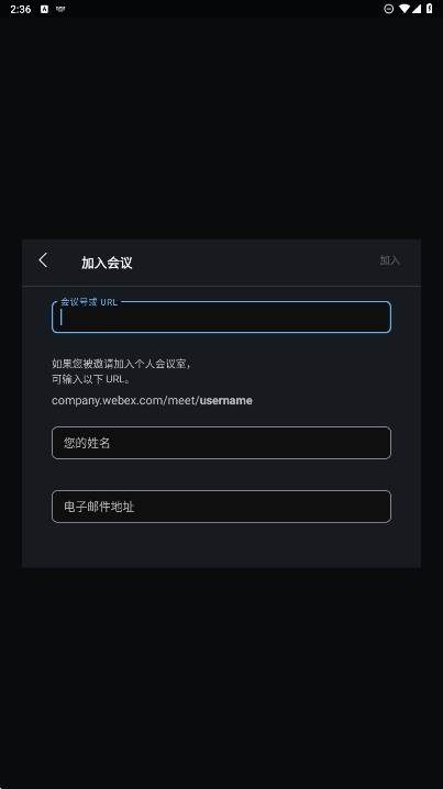 2、进入【加入会议】界面后,我们需要输入我们的会议号或者会议URL,然后填写自己的姓名和电子邮箱,最后点击右上角亮起来的加入就可以了。
