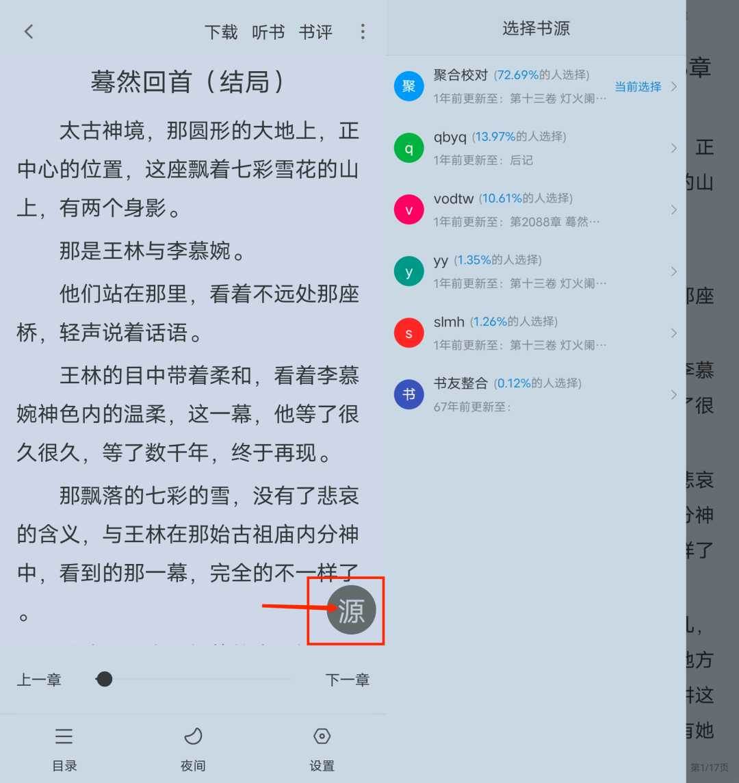在右下角的“源”按钮里,可以自由切换各种书源,主打一个稳定流畅。