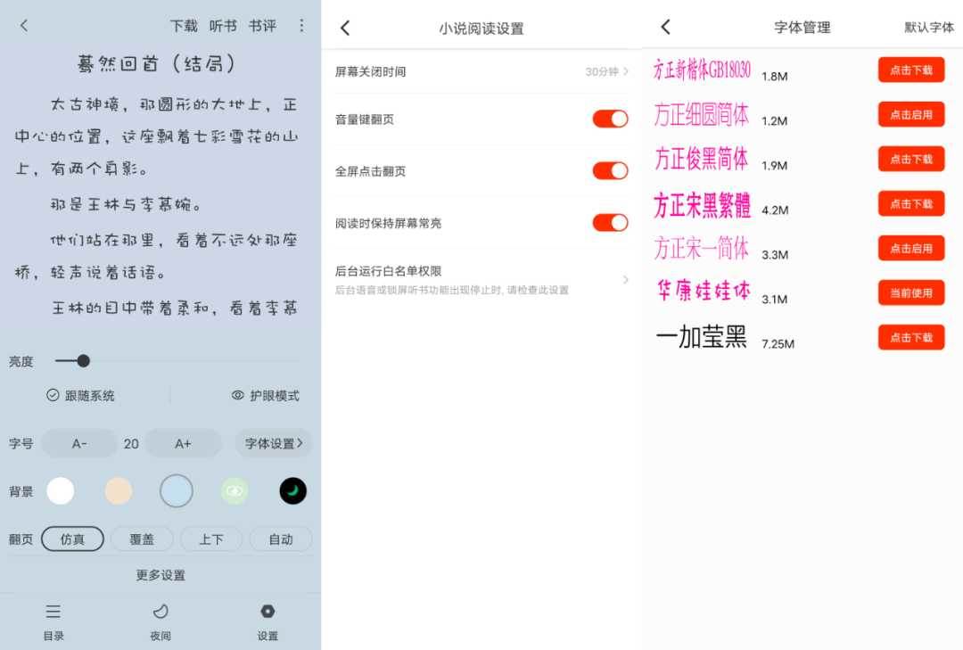支持七种阅读字体自由下载启用,总之怎么看着舒服就怎么来,非常的便捷。