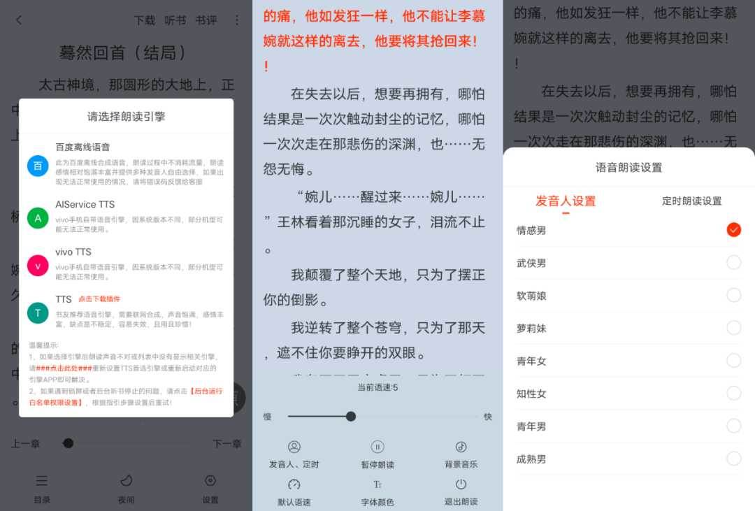 在阅读界面顶部还可以开启听书模式,支持手机系统默认、百度离线和tts朗读引擎。