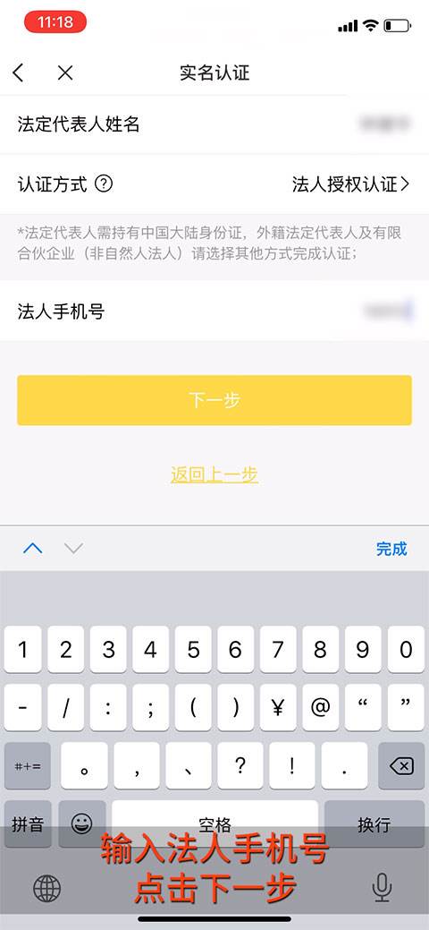 12、输入法人手机号点击下一步。