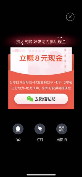 7、以下是粘贴发送给还有的内容,只需好友下载淘特APP登录后复制以下内容再打开APP就会自动弹出助力信息,根据步骤完成即可。