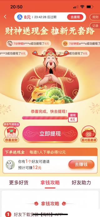 成功邀请7个新用户,点击去提现即可。