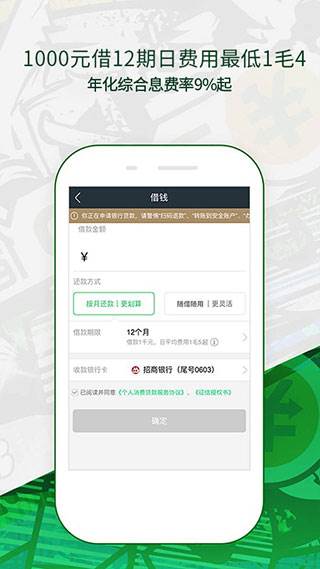 手机贷款额度高:500元起借,额度最高可达20万,现金款项超快到账;