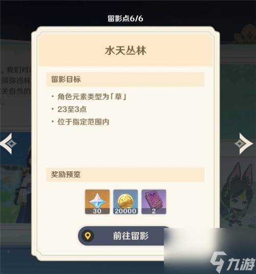 将游戏内时间调整至23至3点,切换出一名草元素角色,与留影点互动,根据喜好进行调整,然后可以在界面左侧查看是否符合留影要求。