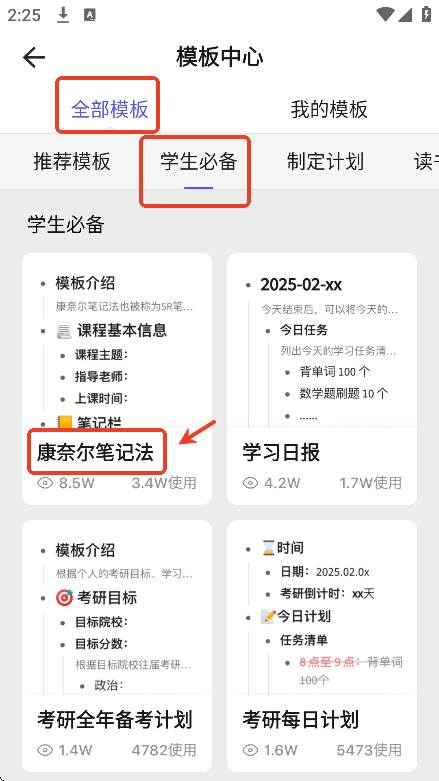 推荐学生用户使用康奈尔笔记法模版来整理自己的课堂笔记
