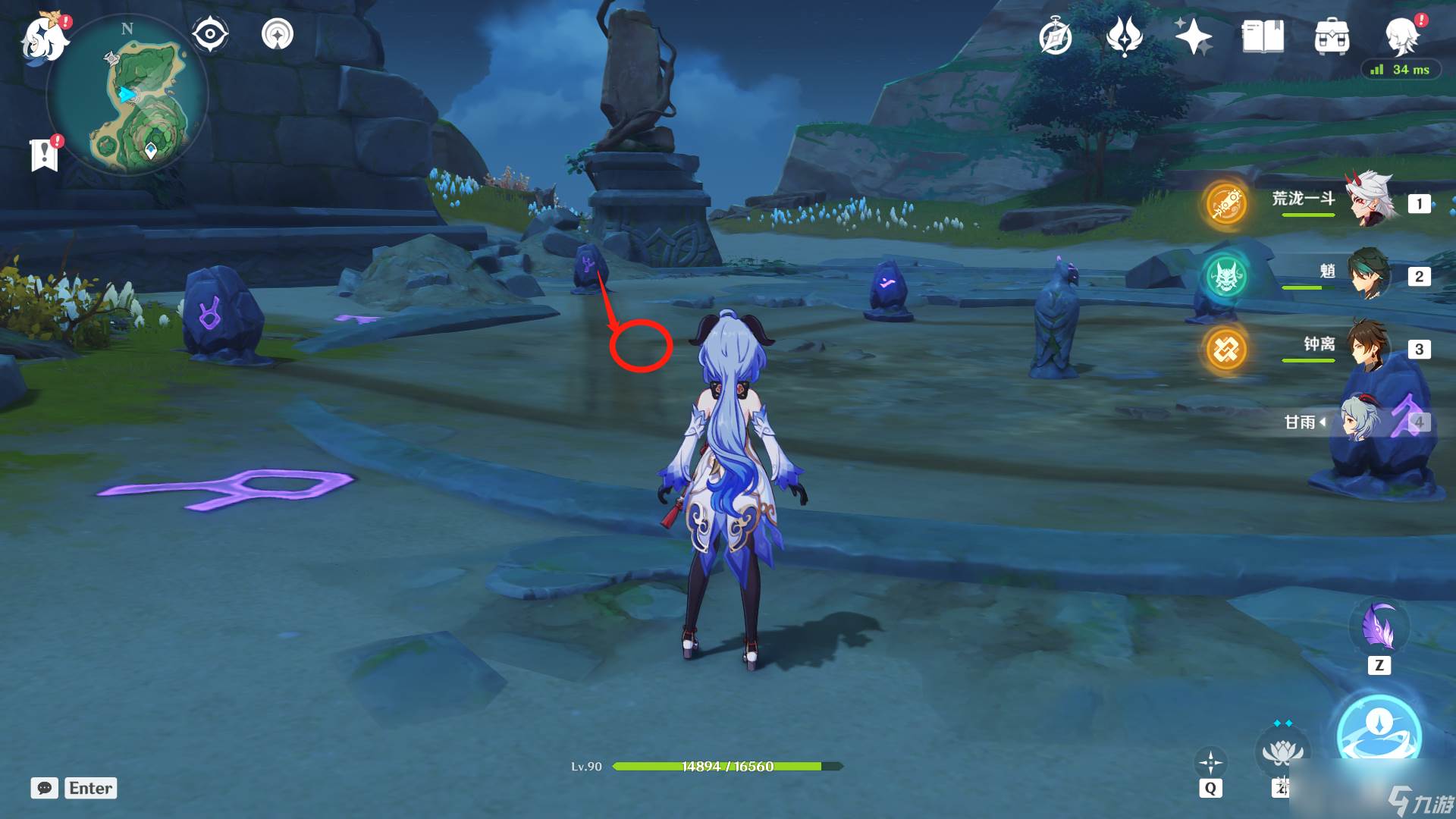 首先分别攻击岛上这四块石头直至全部点亮,如下图。