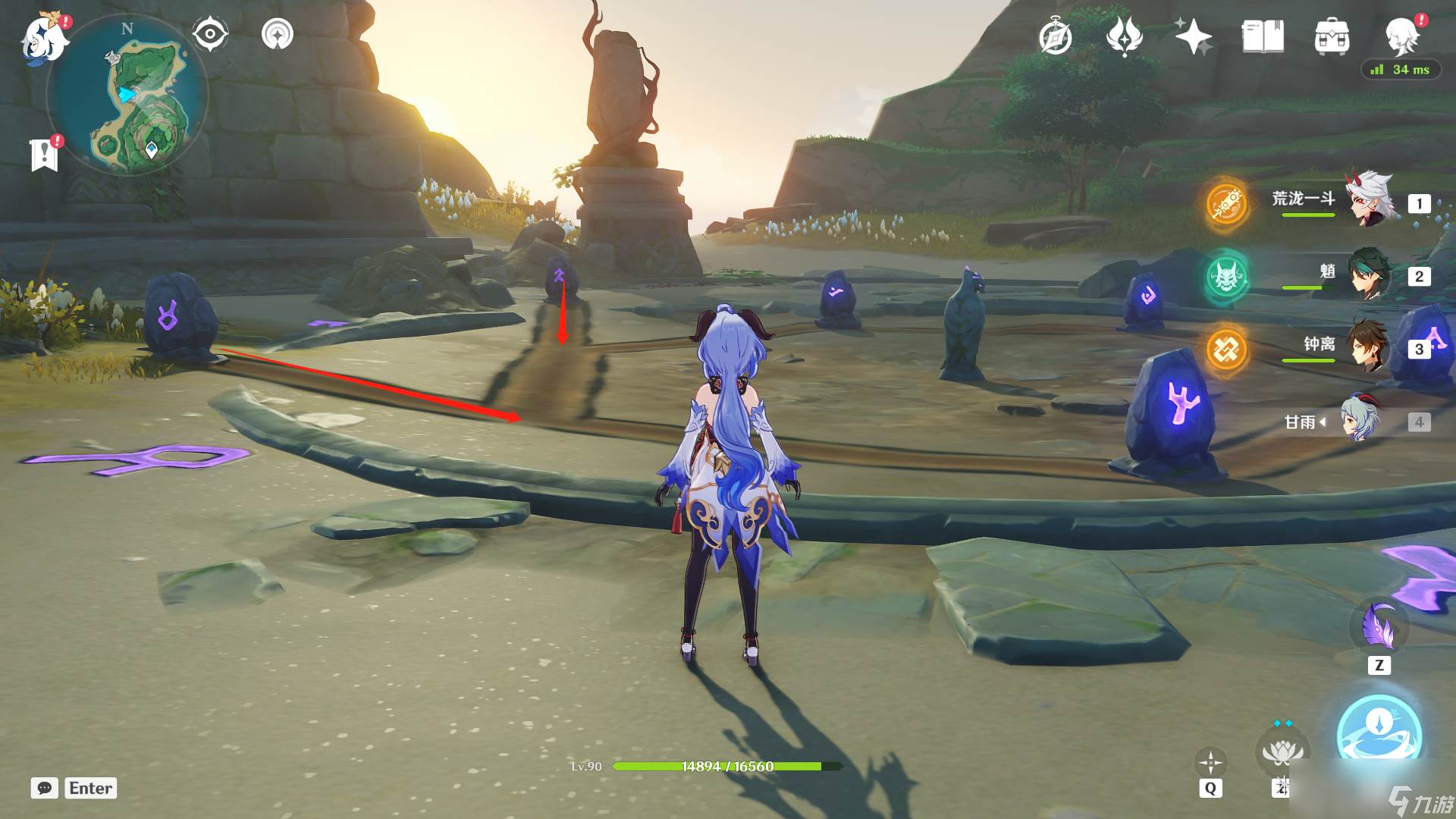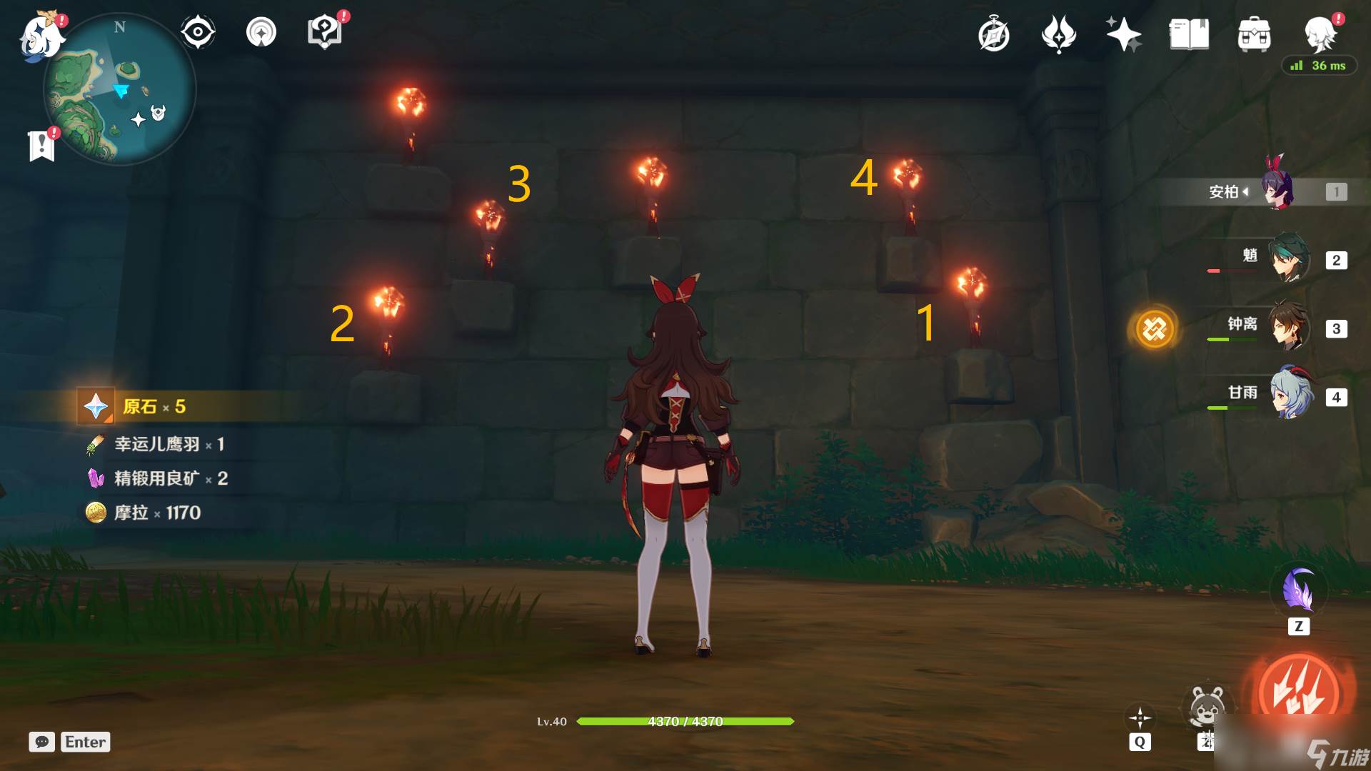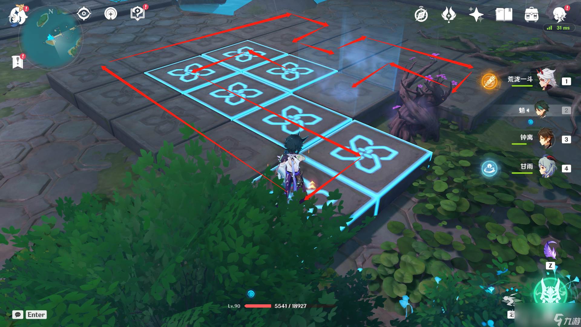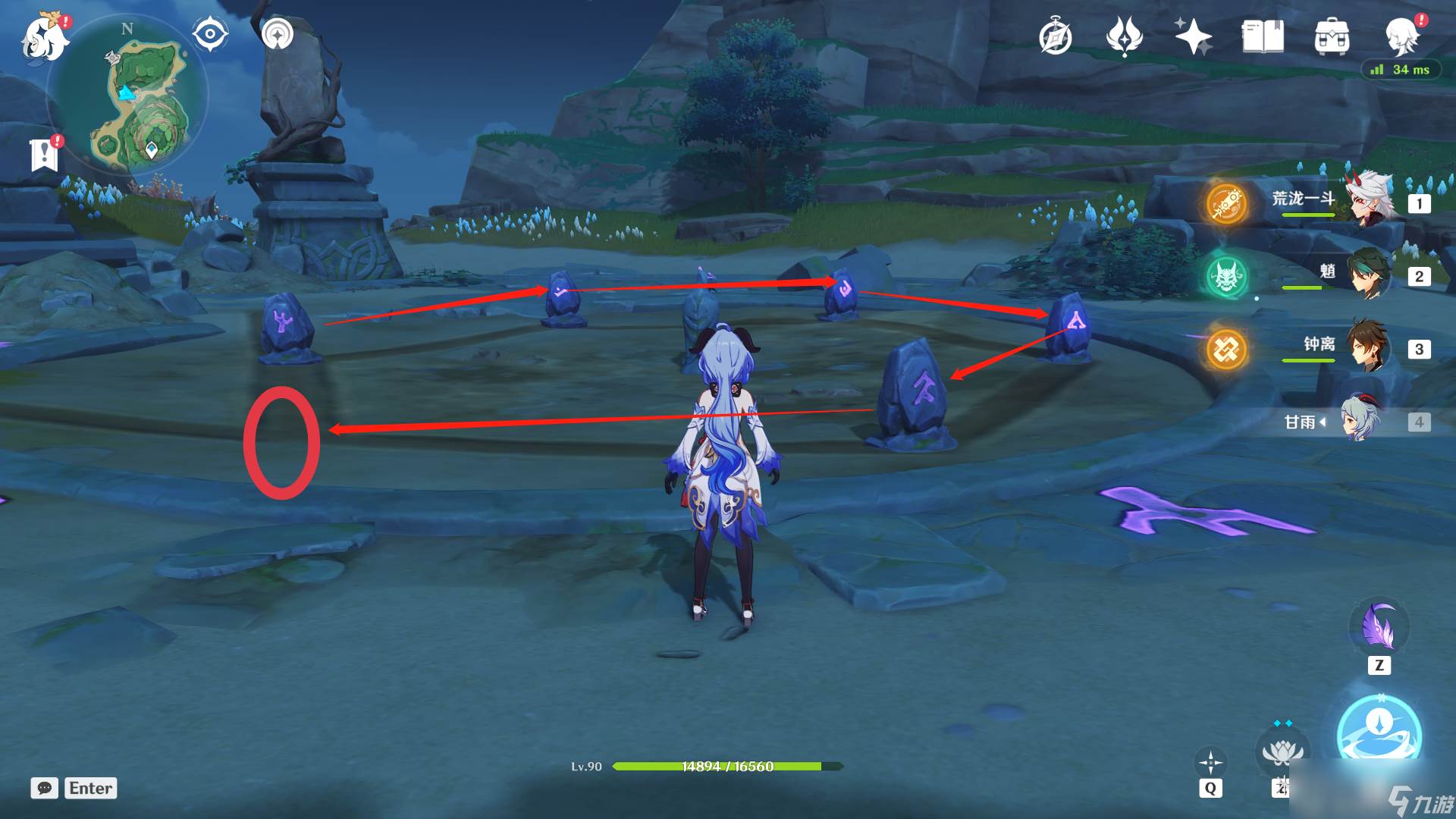 来到上图中的位置,拾取雷种子后按下图所示顺序靠近点亮小石柱,即可获得一个普通宝箱。