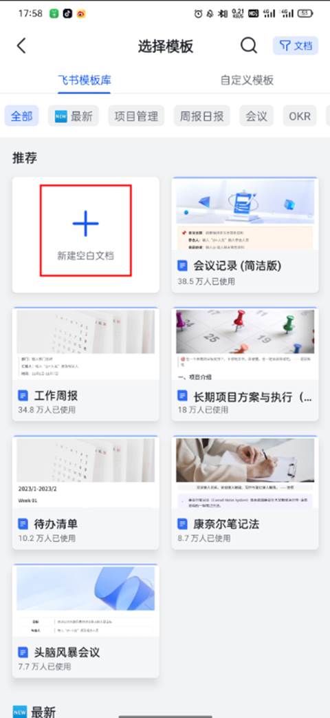 1、打开飞书,进入首页,点击右上角的【+】号,然后点击【创建文档】栏。