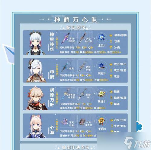 在神里永冻队中,每个角色都有自己的特点和作用。因此我们需要合理搭配队伍来发挥出最大的输出能力。可以选择神里绫华、凯亚、菲谢尔、甘雨这样的组合来形成强大的阵容。