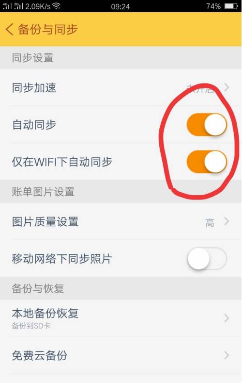 将自动同步开关打开,也可以开启WiFi下自动同步。这样设置之后,系统就会自动同步我们的账本了。