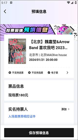 5、最后在预填信息的页面上填写持票人信息(姓名、证件类型及号码)等,点击“保存预填信息”即可预约抢票。