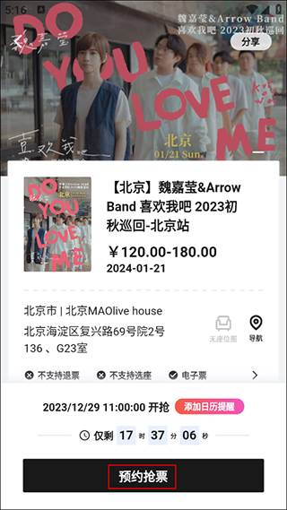2、进入购票栏后可查看抢票倒计时的购票详情,点击打开购票链接;