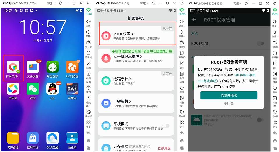 2.第一次开启ROOT权限开关,需要大家点击同意免责《ROOT权限免责声明》,否则无法使用root权限开启云手机的管理员权限。