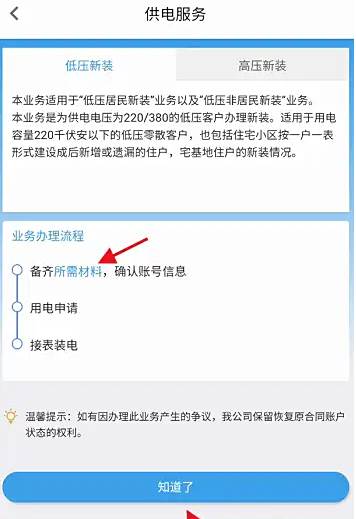 进入供电服务, 备齐相关所需材料,后点击知道了
