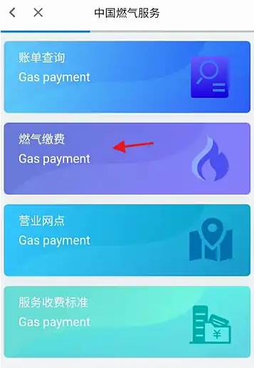 进入中国燃气服务,找到下方的燃气缴费,点击燃气缴费进入