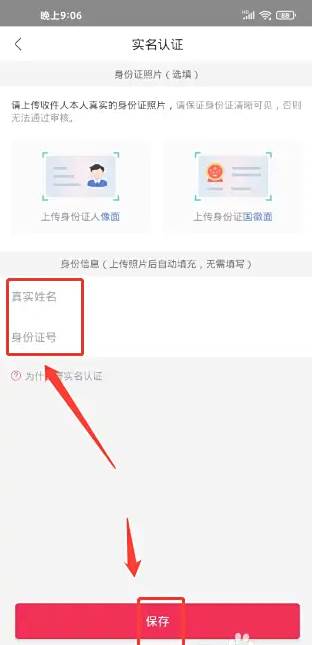 进入实名认证,输入真实姓名、身份证号,点击(保存)选项。