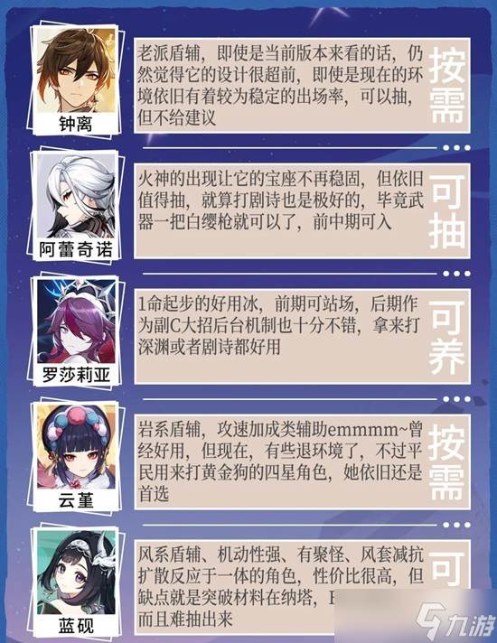 钟离:老派盾辅,即使是当前版本来看的话,仍然觉得它的设计很超前,即使是现在的环境依旧有着较为稳定的出场率,可以抽,但不给建议