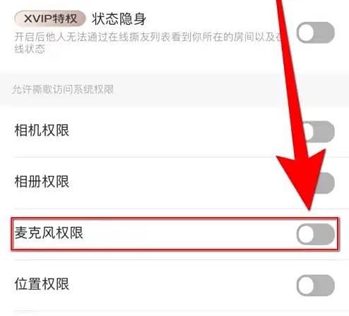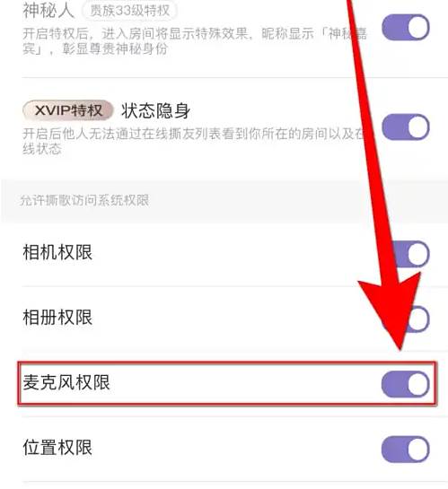 【麦克风权限】后面的圆点变为紫色即表示启用撕歌麦克风权限成功。
