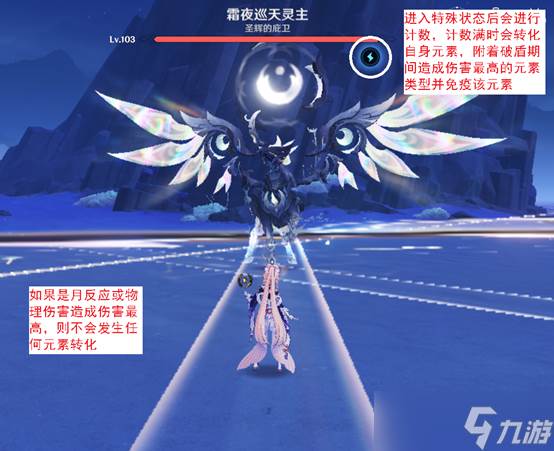 冰马战斗中会进入“晦隐”状态,全抗提升120%,受到50次攻击后解除此状态。攻击为任意元素,哪怕是物理也可以。同时,破盾期间造成最多伤害的元素会被其记录,冰马会免疫该元素伤害,同时永久附着该元素。例如火元素在破盾期间造成最多伤害,那么冰马就会免疫火伤,同时自身附着火元素。因此不要使用后续需要输出的元素来破盾。