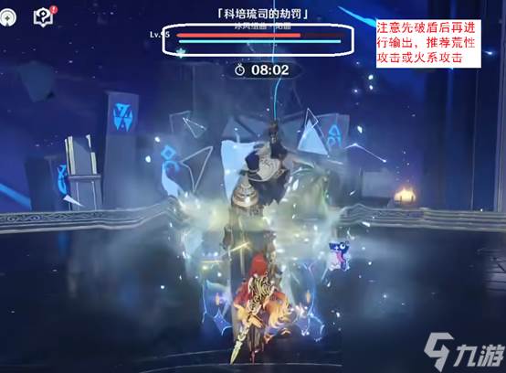 战斗中男舞者会开启冰盾,用荒性攻击,如夏沃蕾,可以直接破除,也可以用火系破除。因此各种超载队伍(含班尼特、夏沃蕾)在这一间特别好用。