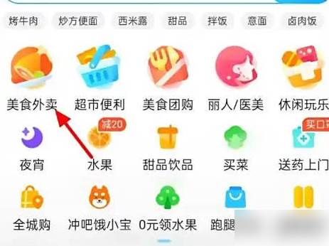 1、首先打开饿了么APP,然后点击上方的美食外卖选项。