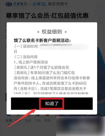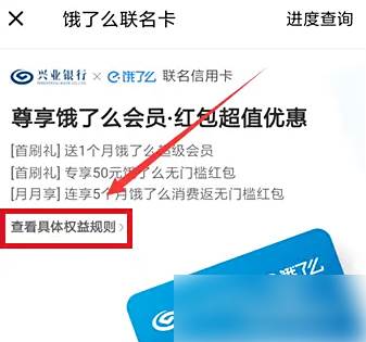 进入饿了么联名卡,点击“查看具体权益规则”。